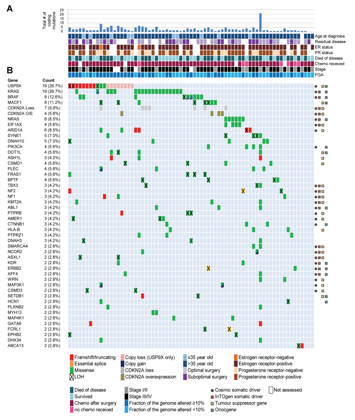 Dane Cheasley等研究者分析了來自全外顯子組(WES)測序隊(duì)列的71例LGSOC患者的127個(gè)候選基因,以生成突變和拷貝數(shù)變異數(shù)據(jù);并進(jìn)行了免疫組織化學(xué)(IHC)檢測,評估了雌激素受體(ER)、孕激素受體(PR)、p53和CDKN2A狀態(tài)。靶向測序發(fā)現(xiàn)47%的病例存在MAPK通路基因(KRAS(26.7%)、BRAF(12.6%)和NRAS(8.5%))突變,以及USP9X(27%)、MACF1(11%)、ARID1A(9%)等驅(qū)動(dòng)基因突變。IHC顯示常見ER/PR陽性(85%),CDKN2A蛋白丟失(10%)或過表達(dá)(6%),所有樣本均為p53野生型。與HGSOC不同,LGSOC的同源重組修復(fù)缺陷(HRD)評分平均僅為3(0-48)分,僅有3例評分大于42分被判為陽性[5]。