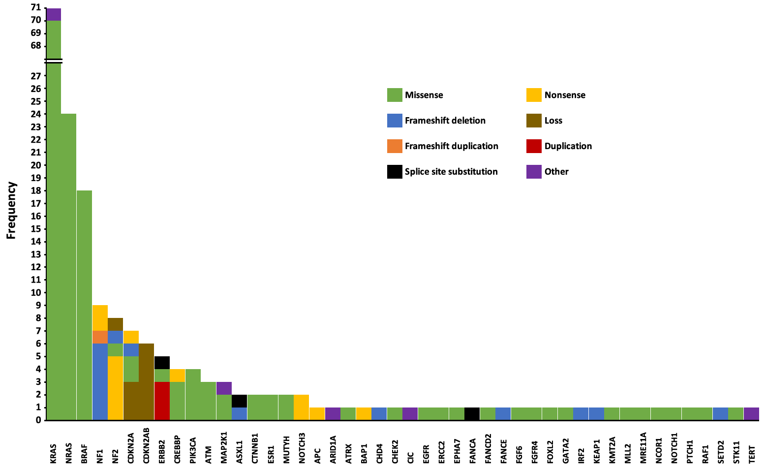 David M Gershenson等研究者報(bào)道了一項(xiàng)LGSOC隊(duì)列MAPK通路突變特征研究結(jié)果:共納入接受了高通量測序(NGS)檢測的215例LGSOC患者,診斷時(shí)的中位年齡為46.6歲,大多數(shù)為III期原發(fā)性卵巢癌。140例(65.1%)的病例中發(fā)現(xiàn)一個(gè)或多個(gè)突變,52.6%的患者在MAPK通路中發(fā)生突變,突變基因包括KRAS、NRAS、BRAF、MAP2K1和RAF1,最常見的突變是KRAS(n=71,33.0%)、NRAS(n=24,11.2%)和BRAF(n=18,8.4%)。71個(gè)KRAS突變包括33個(gè)G12D、29個(gè)G12V、3個(gè)G12A、2個(gè)G12R、1個(gè)G12S、G12C和G12_G13insAG。MAPK通路突變患者的無進(jìn)展生存(PFS)數(shù)據(jù)優(yōu)于未檢出MAPK突變的患者(31.4個(gè)月 vs 23.7個(gè)月,p=0.002)。MAPK通路突變患者的總生存(OS)數(shù)據(jù)優(yōu)于未檢出MAPK突變的患者(147.8個(gè)月 vs 89.5個(gè)月,p=0.01),亦優(yōu)于腫瘤未檢出突變的患者(147.8個(gè)月 vs 78個(gè)月,p=0.001)[6]。