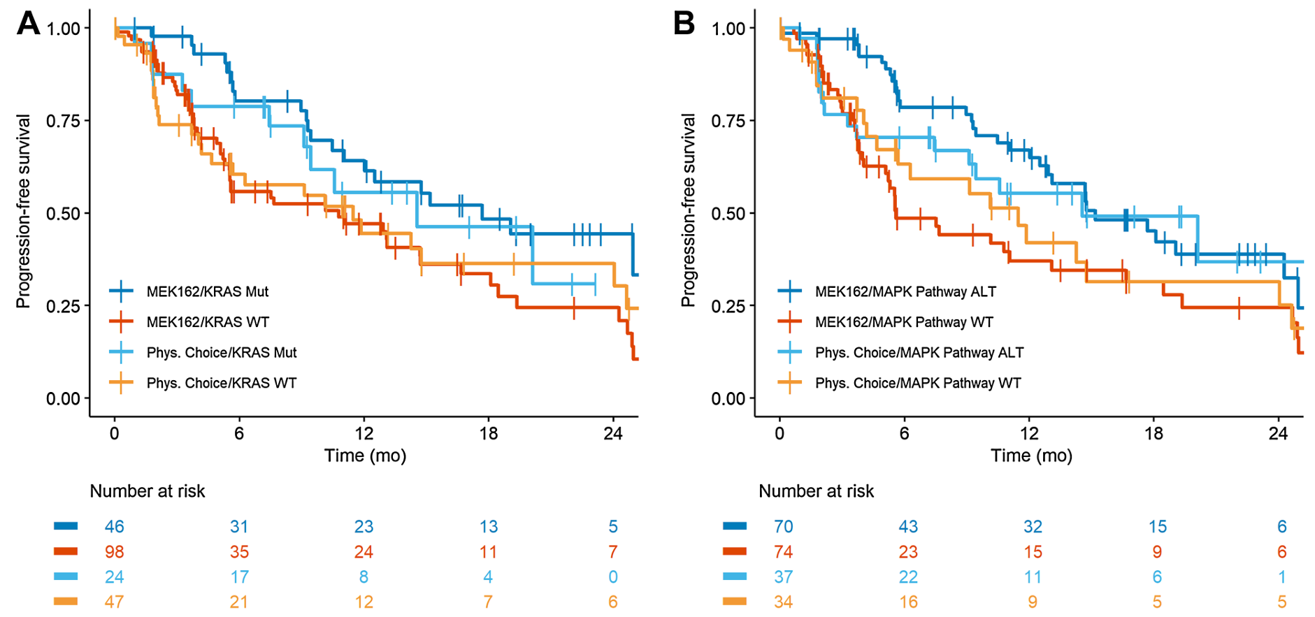 MILO/ENGOT-ov11研究(NCT01849874)招募了341例復(fù)發(fā)性LGSOC患者,以2:1隨機(jī)分配至Binimetinib組或醫(yī)師選擇的化療(PCC)組,主要終點(diǎn)為盲態(tài)獨(dú)立評審委員會(huì)(BICR)評估的PFS。303例患者的中期分析發(fā)現(xiàn),Binimetinib組對比PCC組,中位PFS為9.1個(gè)月vs 10.6個(gè)月(HR=1.21,p=0.807),根據(jù)預(yù)先設(shè)定的無效邊界提前結(jié)束研究。215例接受了分子檢測,33%檢出KRAS突變。Binimetinib組中,KRAS突變與野生型患者相比,應(yīng)答率為44% vs 19%(p=0.004),中位PFS為17.7個(gè)月 vs 10.8個(gè)月(p=0.006),而PCC組的PFS則沒有這種關(guān)聯(lián)(p=0.502)。其他檢測到的MAPK通路改變包括NRAS(n=11,8.1%)、BRAF V600E(n=8,5.9%)、RAF1(n=2,1.5%)和NF1(n=7,5.2%)。Binimetinib組中,MAPK變異與野生型患者相比,應(yīng)答率為41% vs 13%(p<0.001),且有更長的PFS(HR=0.5,p=0.003)[9-10]。