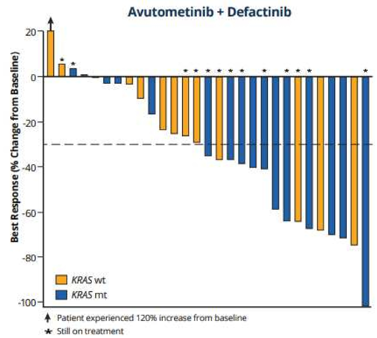 其獲批基于開放標(biāo)簽的多中心II期RAMP-201 研究(NCT04625270),共納入57例KRAS突變復(fù)發(fā)性LGSOC成年患者,患者必須至少接受過一次系統(tǒng)治療,包括以鉑為基礎(chǔ)的治療方案。通過對腫瘤組織進(jìn)NGS或聚合酶鏈反應(yīng)(PCR)檢測來確定KRAS突變狀態(tài), 本次FDA并未同步批準(zhǔn)KRAS伴隨診斷檢測?;颊呖诜嗀vutometinib 3.2 mg,每周2次,口服Defactinib 200 mg,每天2次,直至疾病進(jìn)展或不可耐受的毒性。研究的主要終點(diǎn)為BICR評估的ORR[11]。